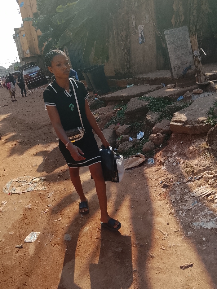 A young woman walks on a dirt road in an urban area. She wears a black dress with white trim and a cross emblem, a small shoulder bag, and sandals. She carries black and white shopping bags. The road is littered, and concrete debris lines the roadside. Buildings are visible in the background with pedestrians and a car. A faded sign stands near some rocks. Sunlight casts long shadows on the ground.