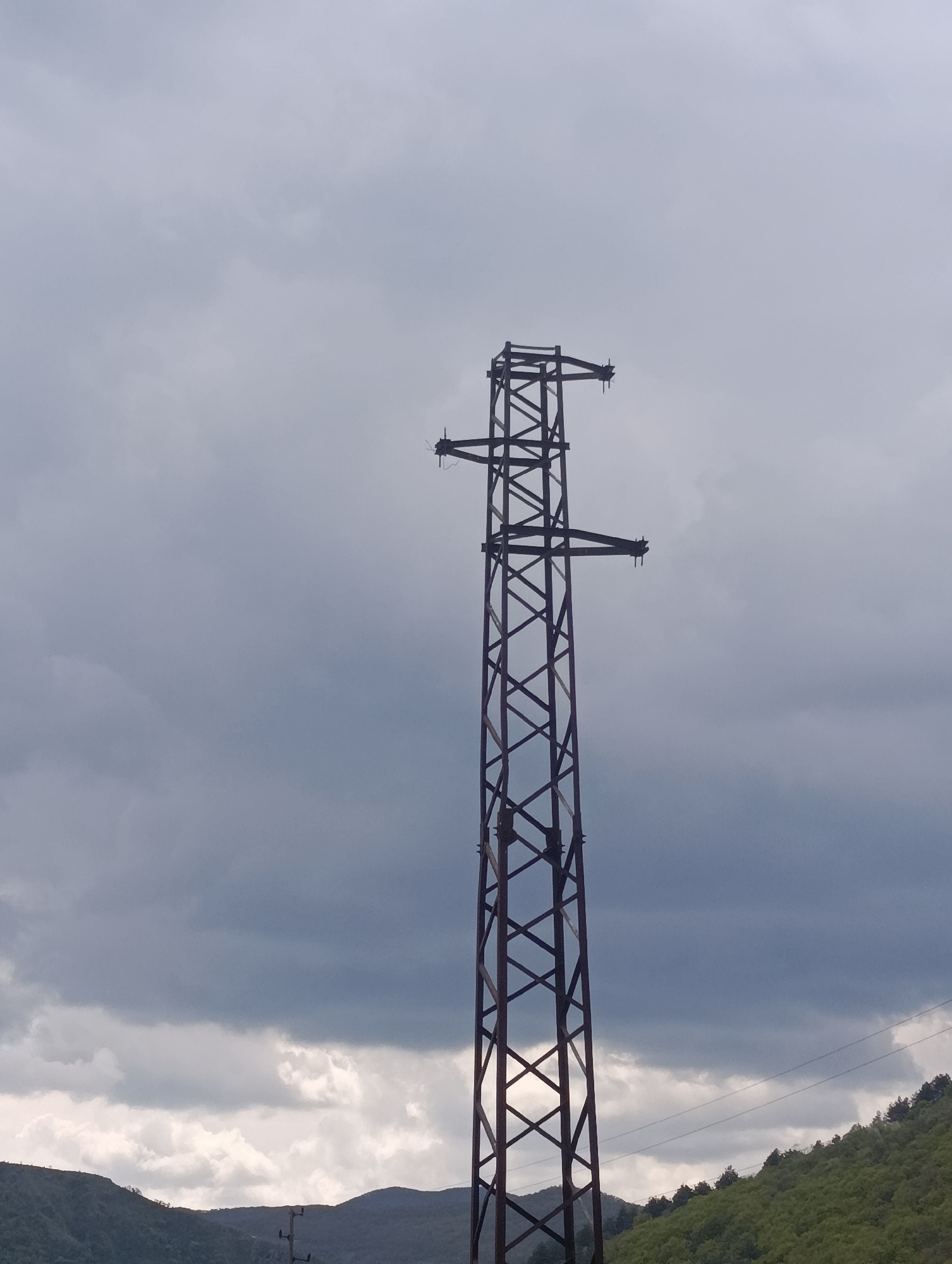 A tall, metal electricity pylon stands prominently against a backdrop of overcast skies. The tower is constructed of a latticework of metal beams, forming a strong, geometric structure. Its top is equipped with arms for supporting power lines. Below the pylon, in the distance, is a landscape of rolling hills covered with green vegetation. Additional power lines are visible running along the lower right edge of the frame. The photo was taken in the city of Shiroko pole, Bulgaria.