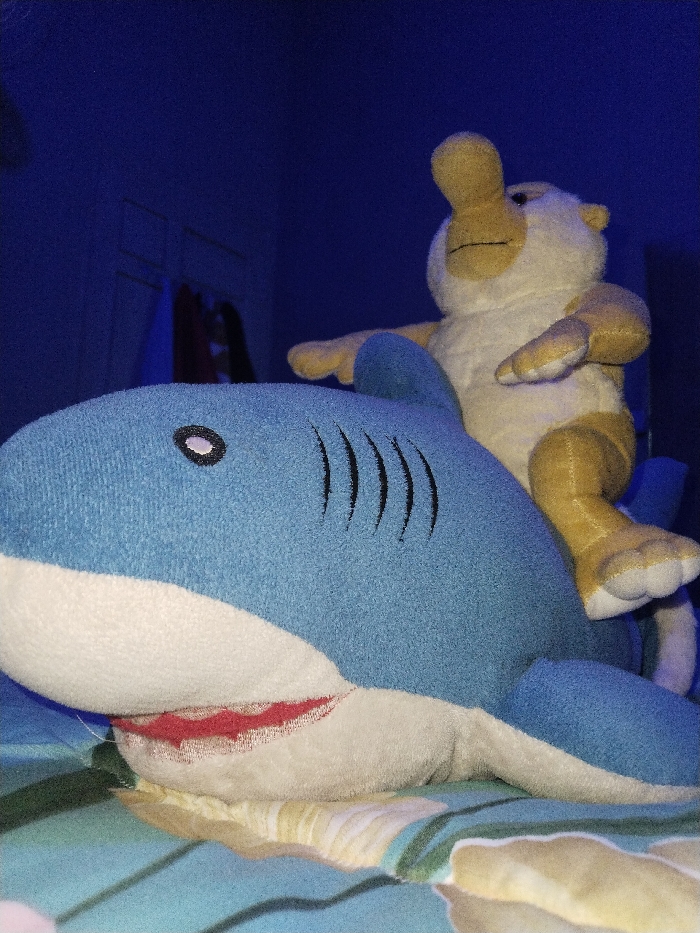 The image displays an indoor scene, stipulated as being in the city of Pie, Indonesia. Two stuffed animal plush toys are the primary subjects, arranged on a patterned fabric surface, likely a bedsheet. A large blue and white plush shark, featuring embroidered black gills, an eye, and a red mouth lining, occupies the lower and central portion of the frame, facing left. Positioned on the back of the shark is a smaller, yellowish-cream colored plush animal, characterized by a prominent snout, small ears, and four limbs, appearing in a riding or seated posture. The shark rests on a light blue fabric with yellow and green organic patterns. The background consists of a solid dark blue wall, with faint outlines of what appears to be shelving or furniture and indistinct hanging items visible on the left. The entire scene is under dim, blue-tinted artificial lighting.