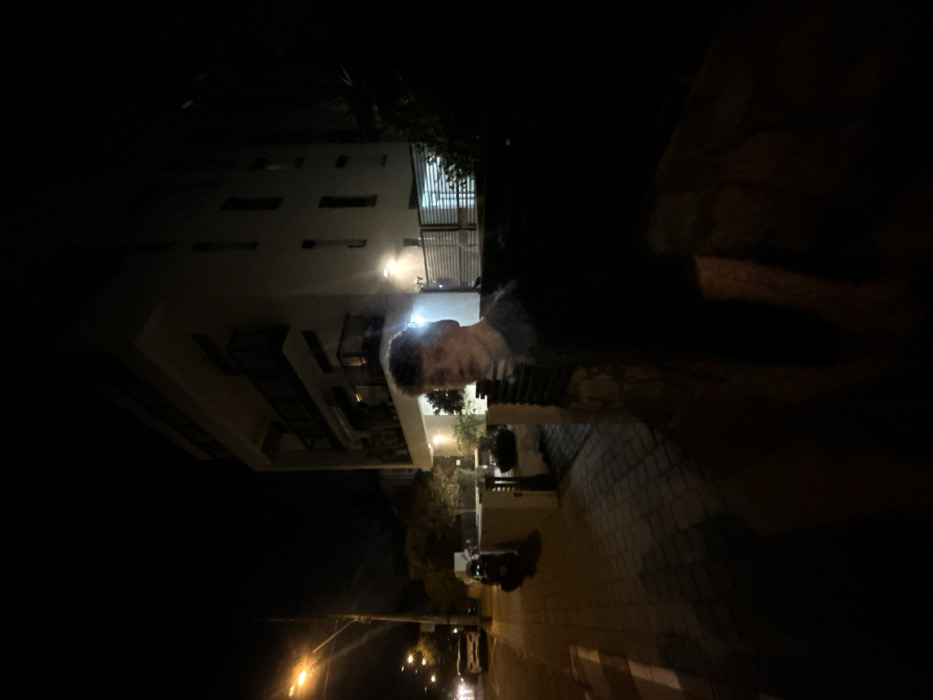 The image displays a nighttime urban street scene in Tel Aviv, Israel. In the immediate foreground, a young male individual with light-colored, curly hair and a dark t-shirt stands, facing the camera. A direct, bright light source, likely a camera flash, illuminates his head and upper torso from the left, creating a prominent glare on the left side of his head. His facial features appear slightly blurred. To the left of the subject, a paved sidewalk with geometric patterns is visible, extending into the background alongside a street. A bright orange-yellow streetlamp is positioned on the far left, casting light onto the street. Further down the street, two light-colored cars are parked or in motion, and a scooter or motorcycle is visible on the sidewalk. To the right of the subject and in the midground, a multi-story, modern residential building with a light-colored facade and multiple balconies is prominently featured. The building exhibits illuminated windows, an outdoor wall sconce near its entrance, and a metal security gate. The overall environment is dimly lit, relying primarily on artificial light sources from streetlamps and the building itself.