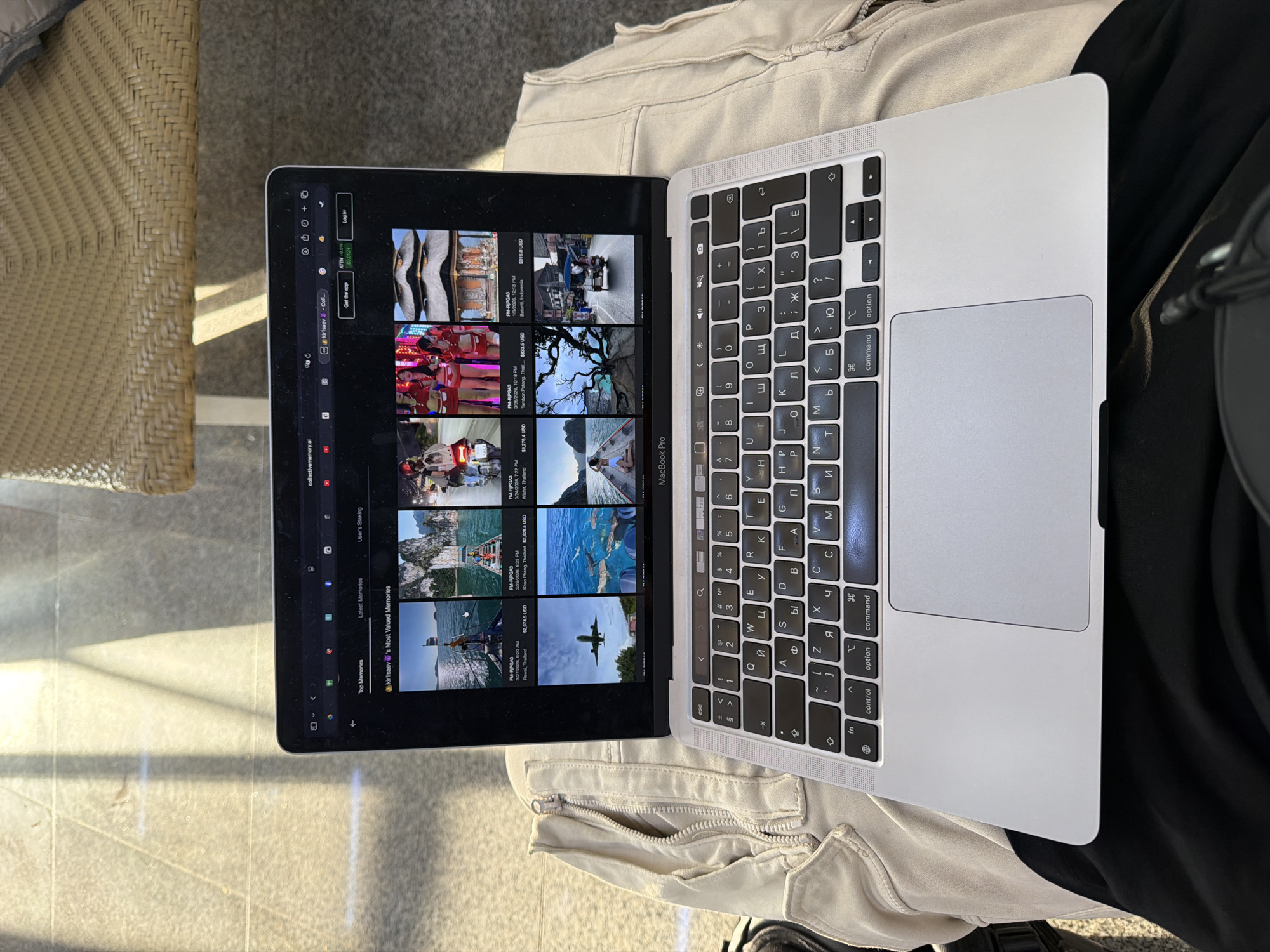 A silver MacBook Pro laptop rests on an individual's lap in Mai Khao, Thailand. The laptop's open screen displays the "collectivememory.ai" website, which presents a dark-themed interface with a grid of nine distinct images. Each image includes a description detailing location (e.g., Rawai, Thailand; Khao Phang, Thailand; Wichit, Thailand; Patong, Thailand; Sakura, Indonesia), date, and a USD price. The visible images depict various scenes, including boats on water, a person on a motorcycle, three individuals in red attire, a traditional building, an airplane, marine life, a person on a boat, a distinctive tree, and a tuk-tuk. The MacBook's keyboard features both English and Cyrillic character layouts. The laptop is positioned over a section of light-beige clothing, possibly a jacket or cargo pants, which covers black trousers on the individual's lap. A zippered pocket is visible on the right side of the beige garment. The surrounding environment consists of a light-colored tiled floor with visible grout lines. Strong, natural light casts sharp shadows across the floor and partially illuminates a woven, light-colored chair fragment in the upper right.