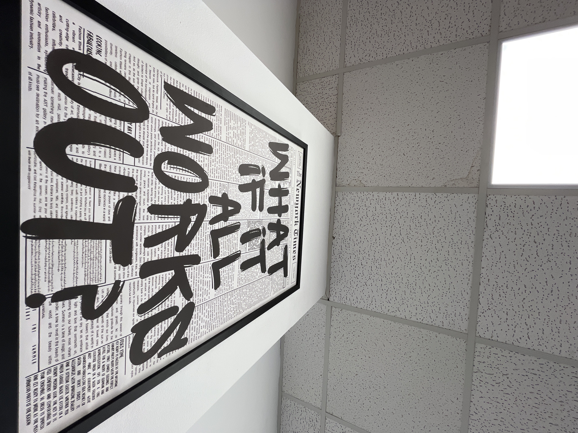 The scene depicts an interior view of a commercial or office space located in Shumen, Bulgaria. A framed poster is mounted on a plain white wall, observed from a low angle looking upward. The poster features a black frame encompassing a white border, behind which a newspaper page serves as the background. Overlaying this background in large, stylized black sans-serif letters is the phrase "WHAT IF ALL WORKS OUT?" concluding with a question mark. Visible text on the newspaper background includes "Newyork Times" (partially visible), "VOL. CIX," "N273011," and "NEW YORK FASHION WEEK," along with columns of unreadable small print. Above the poster, a suspended acoustic tile ceiling, white with a granular texture and supported by a gray grid, occupies the upper portion of the frame. A single, bright rectangular fluorescent light panel is integrated into the ceiling, casting illumination onto the scene. Minor, subtle discoloration or staining is present on a few ceiling tiles, notably near the light fixture. No individuals, interactions, or discernible actions are present within the captured image.