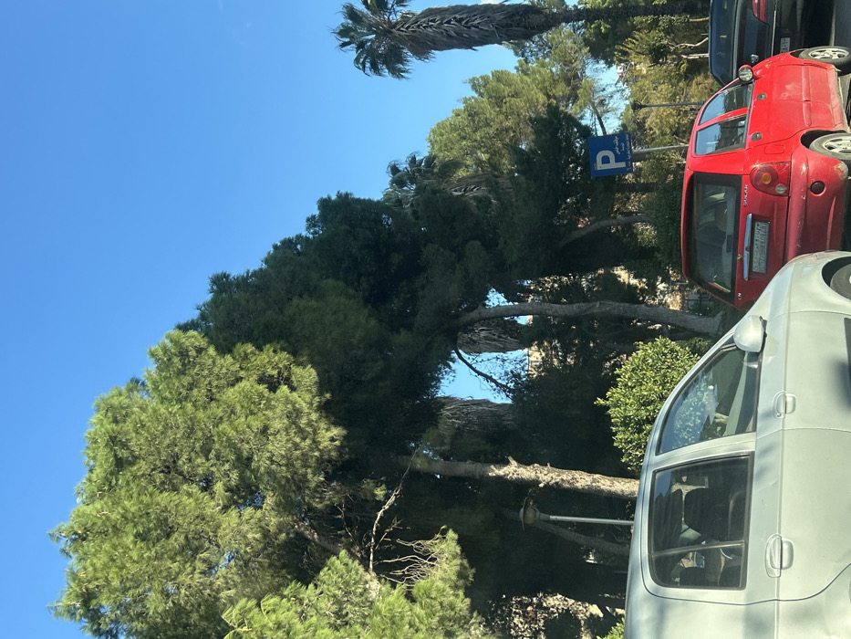 The image displays a daytime urban street scene in Rukn ad-Din Municipality, Damascus, Syria, under a clear, cloudless blue sky. In the foreground on the left, the driver's side profile of a light grey hatchback vehicle is visible. To the right, a red hatchback car is positioned, showcasing its rear with a Syrian license plate that features the Arabic inscription for 'Damascus' (دمشق) and 'Syria'. Partially obscured behind the red car on the far right is a dark-colored sedan. The background is dominated by dense, green foliage, primarily composed of tall evergreen trees, likely pines, with several mature palm trees interspersed, particularly towards the right side. A blue square sign with a white 'P' symbol, indicating parking, and additional Arabic text, is visible to the right of the red car. A single street light pole can be seen among the trees on the left. Faint outlines of buildings are discernible in the distance through the tree canopy.