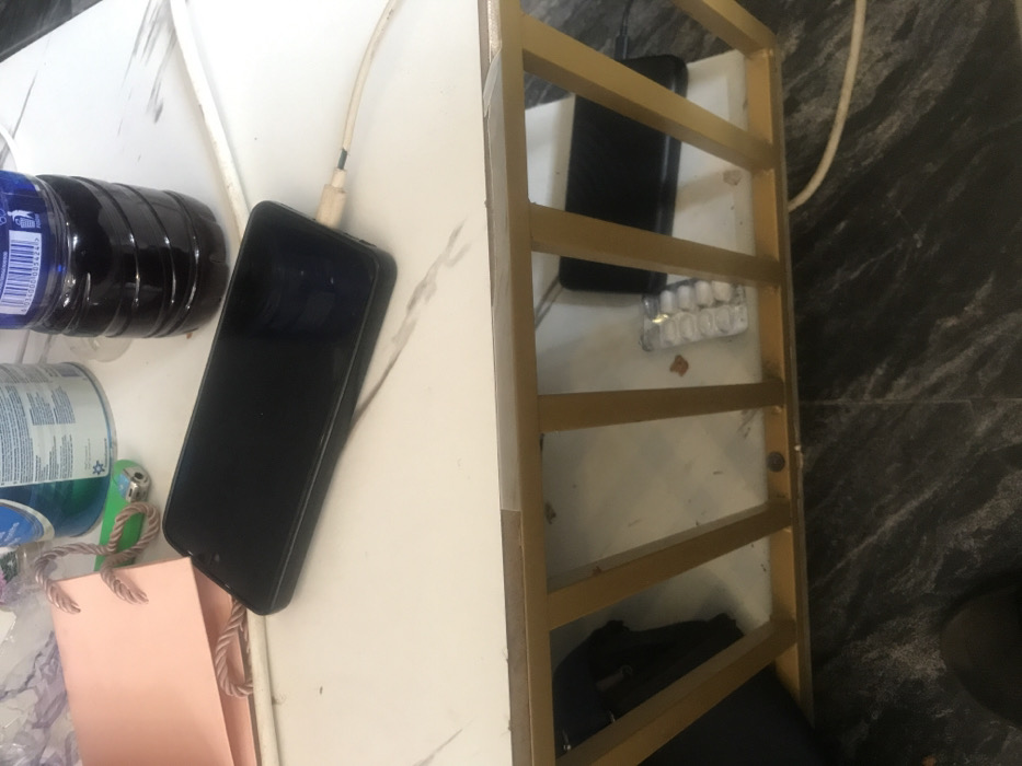 The scene is an interior view within the city of Akure, Nigeria, depicting a still life arrangement on and around a multi-tiered table or shelving unit. The upper surface, appearing to be white marble-patterned, holds a black smartphone connected to a white charging cable, a partially visible blue-labeled plastic bottle containing a dark liquid, a green disposable lighter, a white aerosol can with a blue label (partially reading "PROTEC..."), and a small pink paper gift bag with braided handles. The table structure beneath consists of gold-colored metal bars. Below this structure, on what appears to be a lower shelf or the floor, a second black smartphone is present, along with a transparent blister pack containing white pills or capsules, and a dark, indistinct object. The flooring is dark grey or black with a marble-like pattern. A dark shoe or foot is partially visible in the lower-left corner of the frame. Dust and minor debris are visible on surfaces. No individuals are depicted.