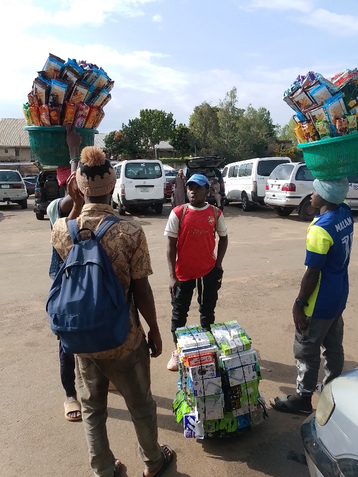 The image depicts an outdoor, daytime scene in a bustling commercial area, likely a motor park or market, in Bukuru, Nigeria. Four individuals are prominent, with several vehicles and buildings in the background. In the foreground left, a person viewed from behind wears a beige patterned shirt, brown trousers, and dark sandals, carrying a dark blue backpack. A light-brown beanie with a pom-pom is on their head, and their right hand is raised. Immediately in front of this person, a second individual (partially obscured) carries a green plastic basket filled with various packaged snacks, balanced on their head. In the center, a male individual faces slightly left, wearing a red short-sleeved t-shirt (resembling an Arsenal jersey), black jogging pants, and light-colored sneakers, topped with a blue baseball cap. He holds a dark object in his right hand and stands beside a large, rectangular stack of white and green boxed merchandise, secured with black straps, resting on the paved ground. To the foreground right, a third person, viewed from behind, wears a blue and yellow short-sleeved shirt with "MALAM 7" visible on the back, dark trousers, and black slides. A light-colored cloth supports a similar green plastic basket, also overflowing with packaged snacks, balanced on their head. The background features multiple parked vehicles, predominantly white vans and a sedan, consistent with a transport hub. Buildings with light-colored walls and dark roofs are visible, interspersed with green trees, under a partly cloudy sky. The ground is paved with asphalt or concrete. The scene portrays street vending activity within an active public space.