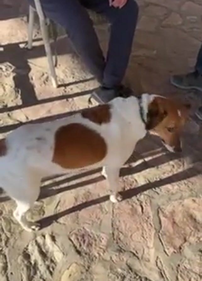A short video depicts a medium-sized, white and brown spotted dog with a collar, standing on a stone-paved outdoor patio