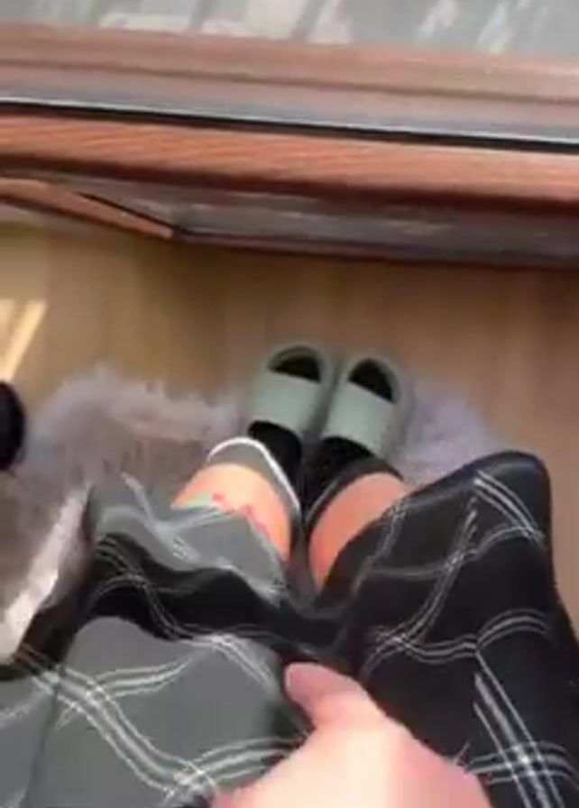 A person sitting on the floor near a window moves a black-and-white plaid skirt over their legs, revealing their knees and socks. The feet are resting on a small white furry rug. The person is wearing light green slide sandals. The window has a brown frame. Music is playing.