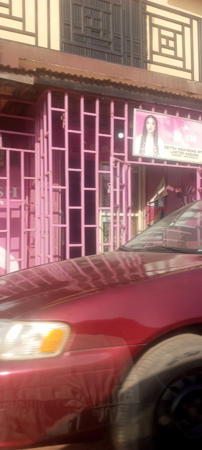 A dark red sedan occupies the lower portion of the frame, displaying its front right fender, headlight, and tire. The car's hood reflects the structure behind it. The midground features the ground level of a commercial building in Kaduna, Nigeria. This level is secured by a pink metal gate arranged in a grid pattern. Behind the gate, a rectangular sign is visible, displaying an image of a woman and text identifying "LUSH," "OBITEX WEAVEONS INT LIMITED KADUNA," and the phone number 0802246451. A partial sign to the left of this reads "SH Hair." Above the ground level, a brown corrugated awning is present, followed by the building's first floor, which features a light yellow facade adorned with black geometric metalwork, likely window grilles or balcony railings. The scene is illuminated by natural light; no individuals are visible.