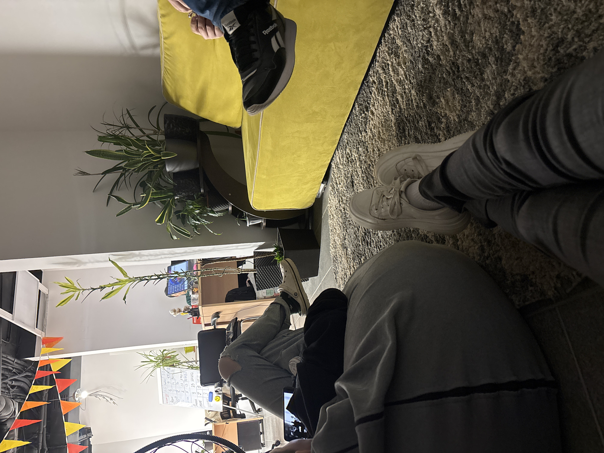 This image depicts an informal office or lounge area in Kazan, Russia, viewed from a low perspective, likely from someone resting on the floor. In the foreground, a pair of legs clad in grey pants and white platform sneakers are visible, resting on a shaggy, light grey rug. To the immediate left, a person is seated on a large, grey beanbag or cushion. This individual wears grey ripped jeans and white Crocs, holding a black smartphone horizontally in their lap, with the screen displaying content. Their left leg is crossed over their right. In the midground, a vibrant yellow velvet couch with white piping is positioned on the right. A person's lower body is visible, wearing blue jeans and black Reebok sneakers, with their feet resting on the couch. Their hands are partially visible, holding a small, metallic object, possibly an electronic cigarette or vape. The background reveals a workspace separated by a partition. A tall, slender green plant stands near the partition. Beyond it, a person is seated at a wooden desk, facing a laptop with its screen illuminated. Another desk with an empty office chair is visible. A white board with handwritten text and numbers, along with a small whiteboard sign displaying a yellow smiley face, hangs on the wall. Numerous potted plants are arranged on shelves and the floor throughout the space. An orange and red triangular pennant banner is strung across the dark ceiling, which features visible conduits and lighting fixtures. The walls are predominantly white, and the flooring consists of both the shaggy rug and a darker, possibly tiled, surface.