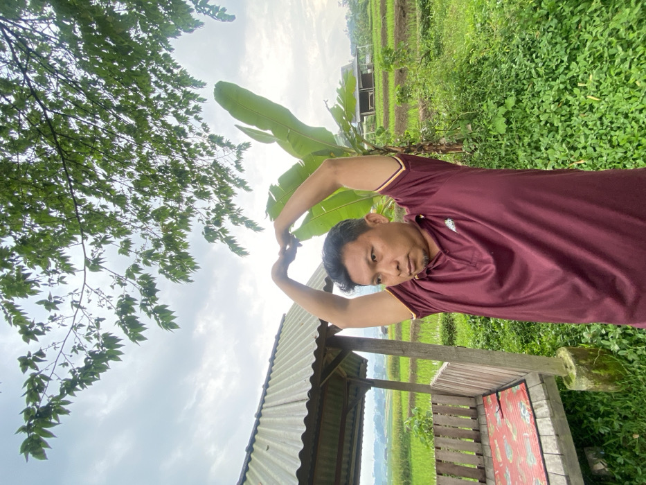 The image captures an adult male performing an overhead arm stretch in a rural setting within Tamiajeng, Indonesia