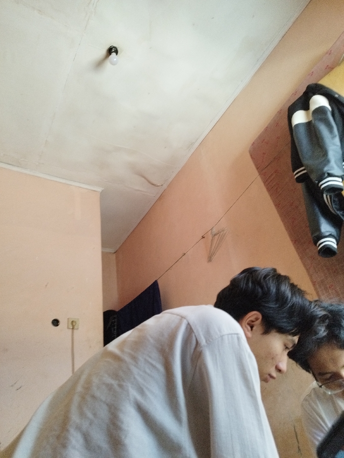 This image depicts an interior room, identified as being in Muka, Indonesia, featuring light peach-toned walls and an off-white ceiling. The ceiling displays visible seams and areas of discoloration or staining, with a single bare lightbulb in a black fixture centrally mounted. On the left wall, a double electrical outlet is present, with a black hole positioned directly above it. A dark blue fabric item is partially visible in the mid-left background. A thin line, likely a clothesline, stretches across a peach wall, holding several white wire hangers. In the upper-right quadrant, a black and white varsity-style jacket hangs. The foreground is occupied by a young male with dark, wavy hair, wearing a light grey collared shirt. His head is tilted downwards, and he appears to be looking at an object or area below the frame. A partial reflection of a person with dark hair and glasses, also looking downwards, is visible to his right, indicating the presence of a mirror.