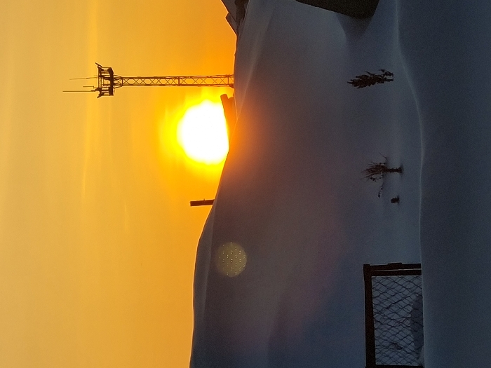 The scene captures a winter landscape in Chaikovsky, Russia, at sunrise or sunset. A brilliant orange-yellow sky dominates, with the sun, a luminous white circle, positioned low on the horizon, partially obscured by a snowdrift. A prominent, dark metal lattice tower, featuring an observation platform at its apex, stands silhouetted against the sun on the right. The foreground and midground are covered in deep, undulating snow, from which several dark, dried plant stalks emerge. A rectangular, dark-framed fence or gate with a mesh infill is partially visible, half-buried in the snow, on the lower-left. A solitary dark post protrudes vertically from a snow dune to the left of the sun. No individuals are present, and no specific actions are depicted. The presence of the tower suggests the vicinity of a winter sports facility, likely the Snezhinka Ski Jumping Complex.