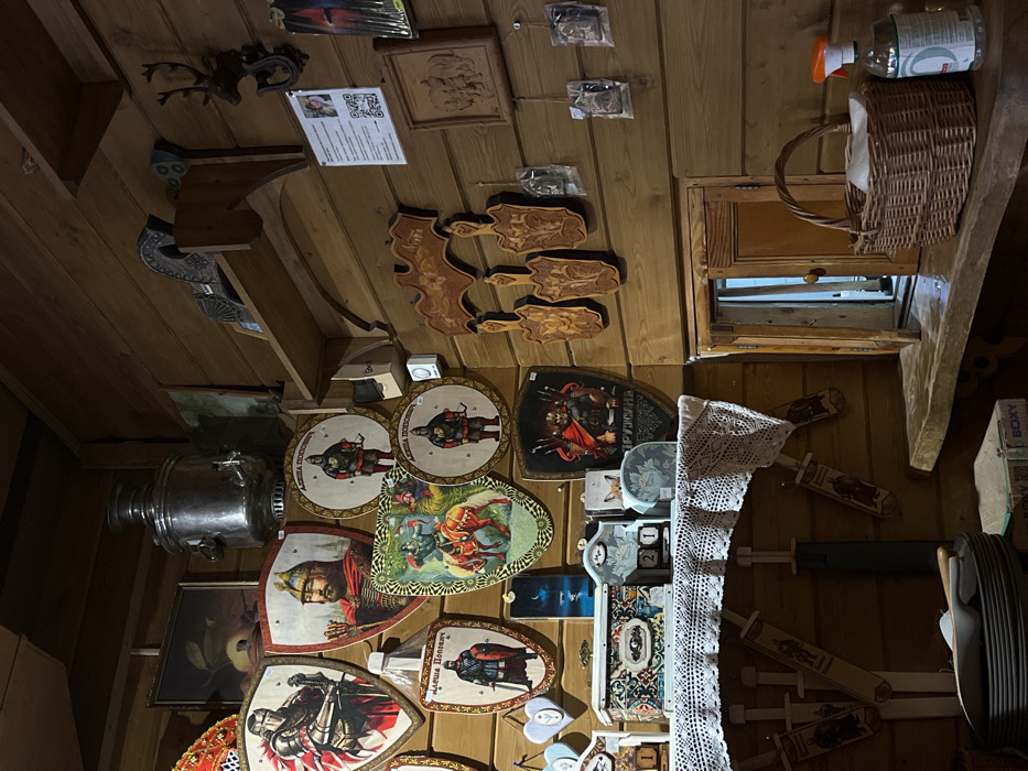 The image depicts the interior of a room in Ново-Никольское, Russia, characterized by walls constructed from vertical light-brown wooden planks. The scene is illuminated by warm, localized artificial lighting. On the upper left wall, an aged, metallic samovar is positioned above a dense arrangement of decorative items. These include multiple wooden plaques and shields, painted with depictions of medieval Russian warriors and heroes, some labeled with "Алёша Попович" and "Дружина." A framed artwork is partially visible behind the samovar. The upper right wall features a wooden shelf holding a carved, stylized wooden horse. Below this, a dark, carved deer head mount is affixed to the wall. A white informational sign displaying text and a QR code is present. A central wooden shelf is draped with a white, crocheted lace tablecloth. This shelf supports various decorative wooden boxes, one functioning as a perpetual calendar set to "21," alongside other small ornaments. Beneath this shelf, several elongated, flat wooden objects, resembling decorative paddles, are suspended vertically. On the mid-right wall, three ornately carved wooden cutting boards hang from a larger decorative wooden panel. Below these, several small, transparently packaged items are suspended from hooks. The lower right section of the image features a small, open wooden hatch, providing a glimpse into another dimly lit wooden interior space. A wooden countertop beneath this hatch holds a woven wicker basket filled with folded white textiles and a clear plastic spray bottle containing a light-colored liquid. In the lower left foreground, a stack of dark plates or shallow bowls, a white utensil, and a partially visible cardboard box are present.