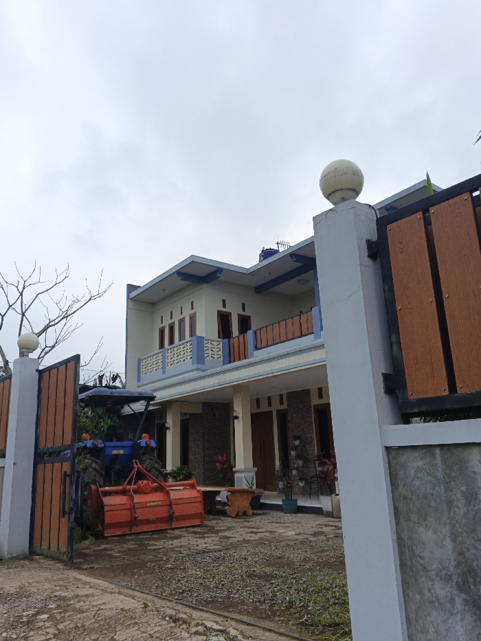 An exterior forensic image depicts a two-story residential property located in Clacuc, Timor-Leste, viewed from a slightly low angle under an overcast sky. The house, positioned centrally, features a light cream-colored facade with blue trim accents on its eaves and balconies. The first floor includes multiple windows and at least one visible wooden door, with a stone-clad section on the exterior wall. A balcony on the second floor presents a light blue patterned railing and reddish-brown, wood-toned elements. A blue water tank and an antenna are visible on the roofline. To the left of the house, a blue tractor, equipped with a large red rotary tiller attachment, is partially parked behind an open gate. The gate comprises light grey concrete posts, one on the right with a white spherical light fixture, and brown, wood-textured panels. The ground in the foreground is unpaved, consisting of dirt, gravel, and sparse vegetation, with a section of concrete paving directly in front of the house. A bare-branched tree is visible behind the left gate post. On the paved area near the house, a rustic wooden bench or table and several chairs are present, along with potted plants. No individuals are visible in the scene.