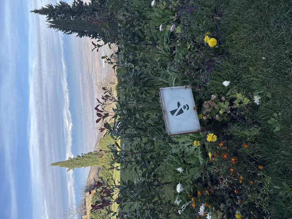 The image depicts an outdoor scenic overlook in Sighnaghi, Georgia, under a partially cloudy blue sky. In the immediate foreground, a weathered, rectangular sign with a white background and a dark, possibly rusty, border is embedded in a dense flowerbed. The sign displays a dark pictogram of a boot stepping on a flower, overlaid with a diagonal line, indicating "Do not step on the flowers." The flowerbed contains a variety of blooming plants, including yellow dandelions, orange and reddish-brown marigolds, and scattered white and purple flowers amidst green foliage. Behind the flowerbed, a line of dark-leafed bushes forms a visual barrier, separating the flowerbed from a neatly maintained green lawn. To the left, a portion of a light-colored stone structure or wall is visible. Further back, two tall, slender evergreen trees, resembling cypress trees, stand prominently against the distant landscape, one on the left and a pair on the right. The background reveals a vast valley stretching into the horizon, appearing somewhat hazy. Beyond the valley, a range of snow-capped mountains is visible under a sky characterized by distinct horizontal cloud formations. The overall scene suggests a cultivated viewpoint with a panoramic vista. No individuals or active subjects are present.