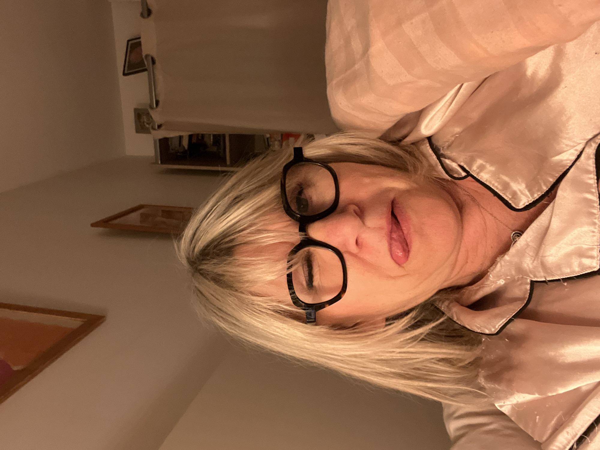 An indoor, front-facing image shows an adult female subject with blonde hair and dark-rimmed eyeglasses. She is performing a facial gesture, winking with her right eye and protruding her tongue from her mouth. She is wearing a light-colored, satin-finish pajama top with black piping along the collar and lapels. A metallic necklace with a small pendant is visible at her throat. Her left arm is partially visible on the right side of the frame, near a light-colored, striped fabric item, likely bedding or a pillow. The background indicates an interior room with warm, dim lighting. A sloped ceiling is present on the left. A framed abstract artwork with orange and purple elements hangs on the wall to the upper left. To the right, a partial view of a wooden shelving unit is visible, along with a light-colored curtain on a rod. Another framed object is situated on the upper right wall. The scene is located in Chambœuf, France.