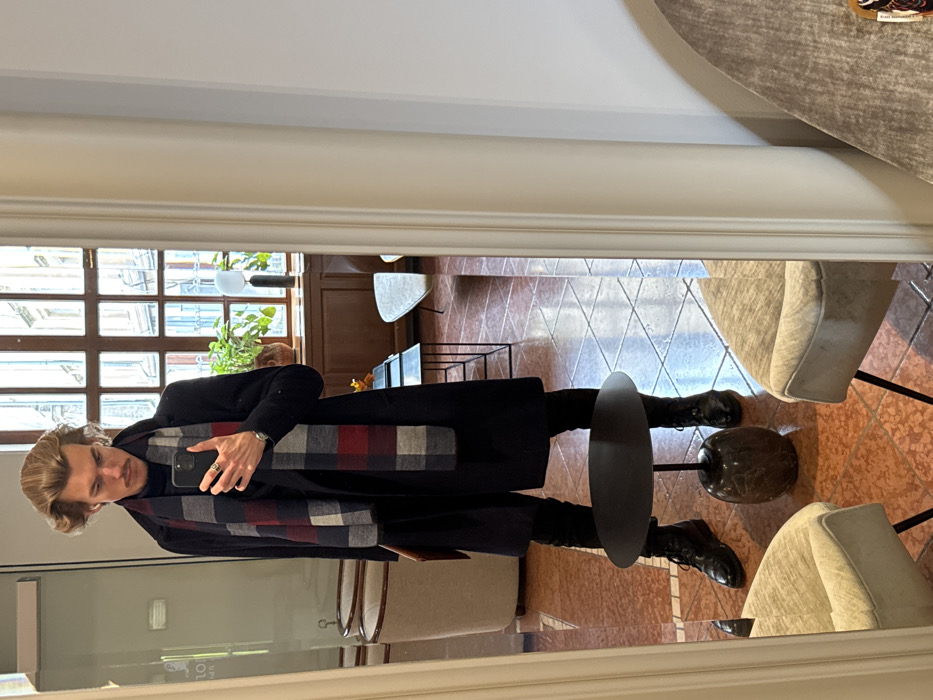 A young adult male is captured taking a mirror selfie within an interior public space in Lviv, Ukraine. The subject, with blonde hair, a mustache, and a goatee, is dressed in a dark turtleneck, a dark mid-thigh length coat, a plaid scarf featuring dark blue, red, and grey hues, black trousers, and black lace-up boots. A silver ring adorns his left ring finger, and a watch is visible on his left wrist. He holds a dark-colored smartphone in his right hand, positioned to reflect his upper body and face. The mirror features a light-colored, molded frame. The foreground of the reflection shows a tiled floor with a diamond pattern in reddish-brown and tan tones, flanked by two light-upholstered chairs and a black circular side table with a dark, rounded base. The background, visible through the mirror and a large multi-paned window, displays the exterior of a city street with traditional multi-story European buildings. Inside, further within the reflected space, are additional minimalist black tables, potted plants, and modern decorative objects, indicative of a lounge or lobby.