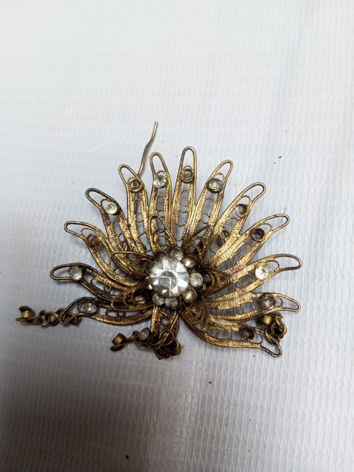 - "A tarnished brass or bronze filigree ornament, designed in a stylized floral or sunburst pattern, is positioned centrally against a white, subtly textured surface that exhibits faint grid-like indentations and minor dark specks" by FM-pCjCH3, licensed under CC BY 4.0