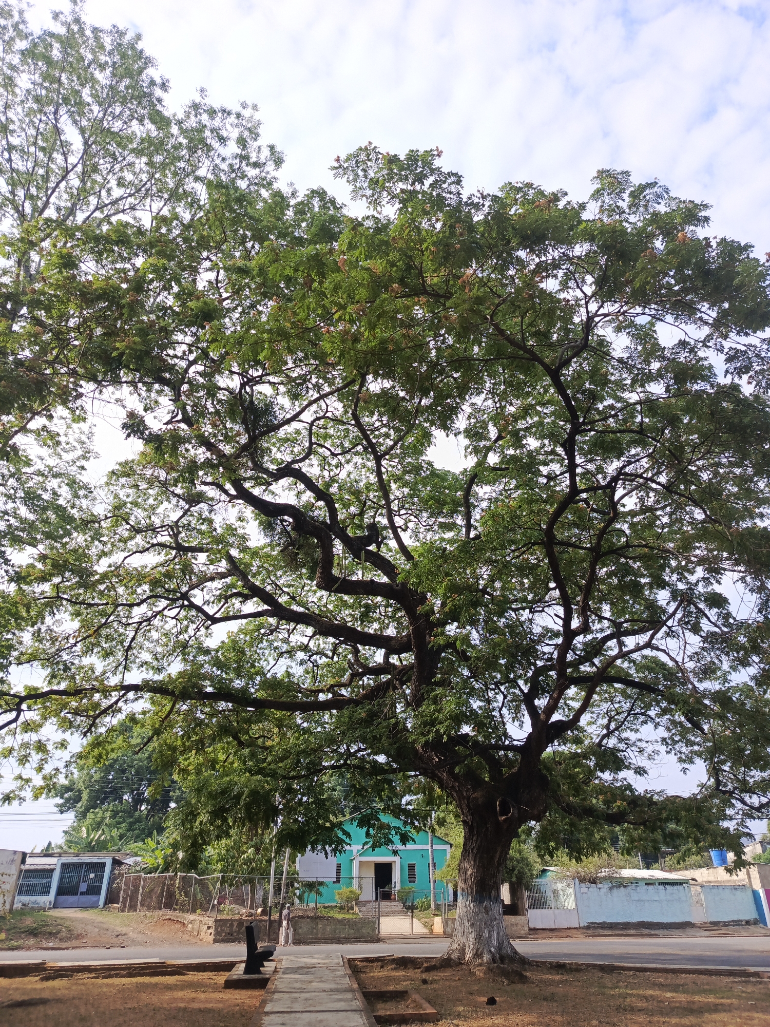 A large, mature tree dominates the foreground of this image taken in what appears to be a town square or park. The tree's trunk is thick and partially painted white at the base, with sprawling branches reaching up towards a sky dotted with light clouds. Some branches show evidence of small red flowers. In the middle ground, behind the tree, are several buildings, including one that's painted a vibrant teal color. Fences and walls delineate the properties. A paved walkway leads towards the buildings, and a dark object (possibly a bench or statue) sits on the walkway. The location is Tinaco, Venezuela. The scene is generally quiet, suggesting a peaceful moment in the town. No people are visibly discernible in the image.