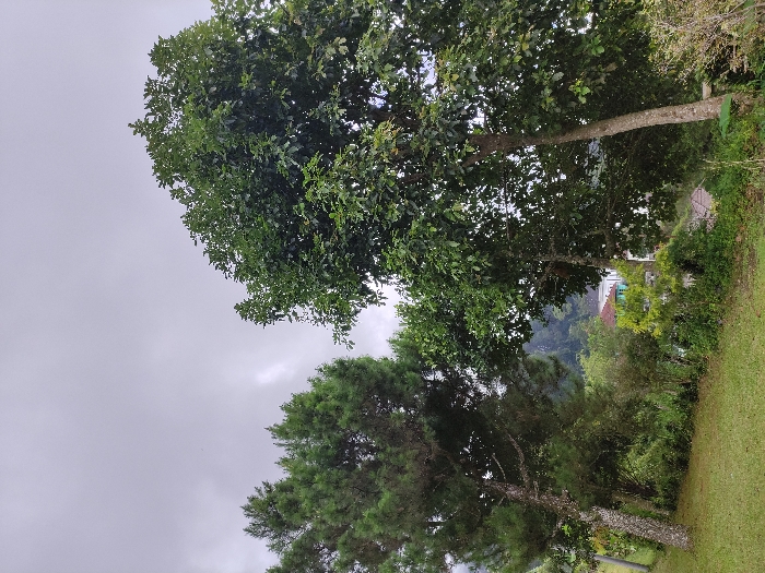 A landscape showcases two trees under a cloudy sky. The first tree, at the top, is broad-leafed and the second, at the bottom, is a pine tree. Green grass covers the foreground, leading into lush greenery, including other trees and bushes. A glimpse of buildings and distant mountains add depth. The photograph is taken from a low angle, emphasizing the height of the trees.