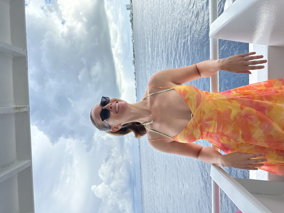 An adult female stands on the deck of a white vessel, offshore from George Town, Cayman Islands