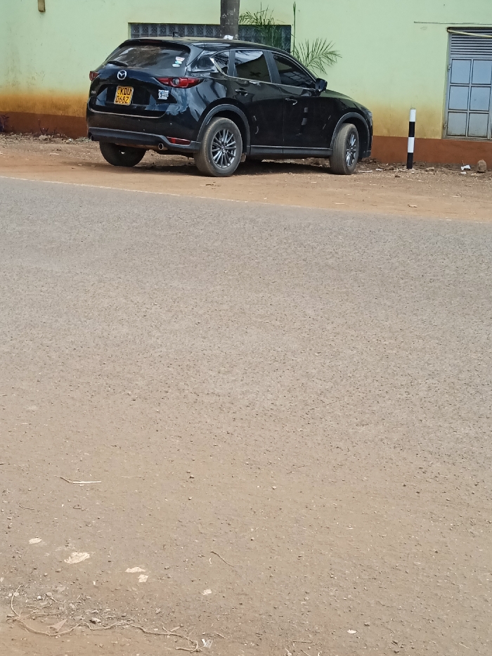A black Mazda CX-5 SUV, bearing Kenyan license plate KDU 068Z, is parked on a dirt shoulder adjacent to an asphalt road in Embu, Kenya