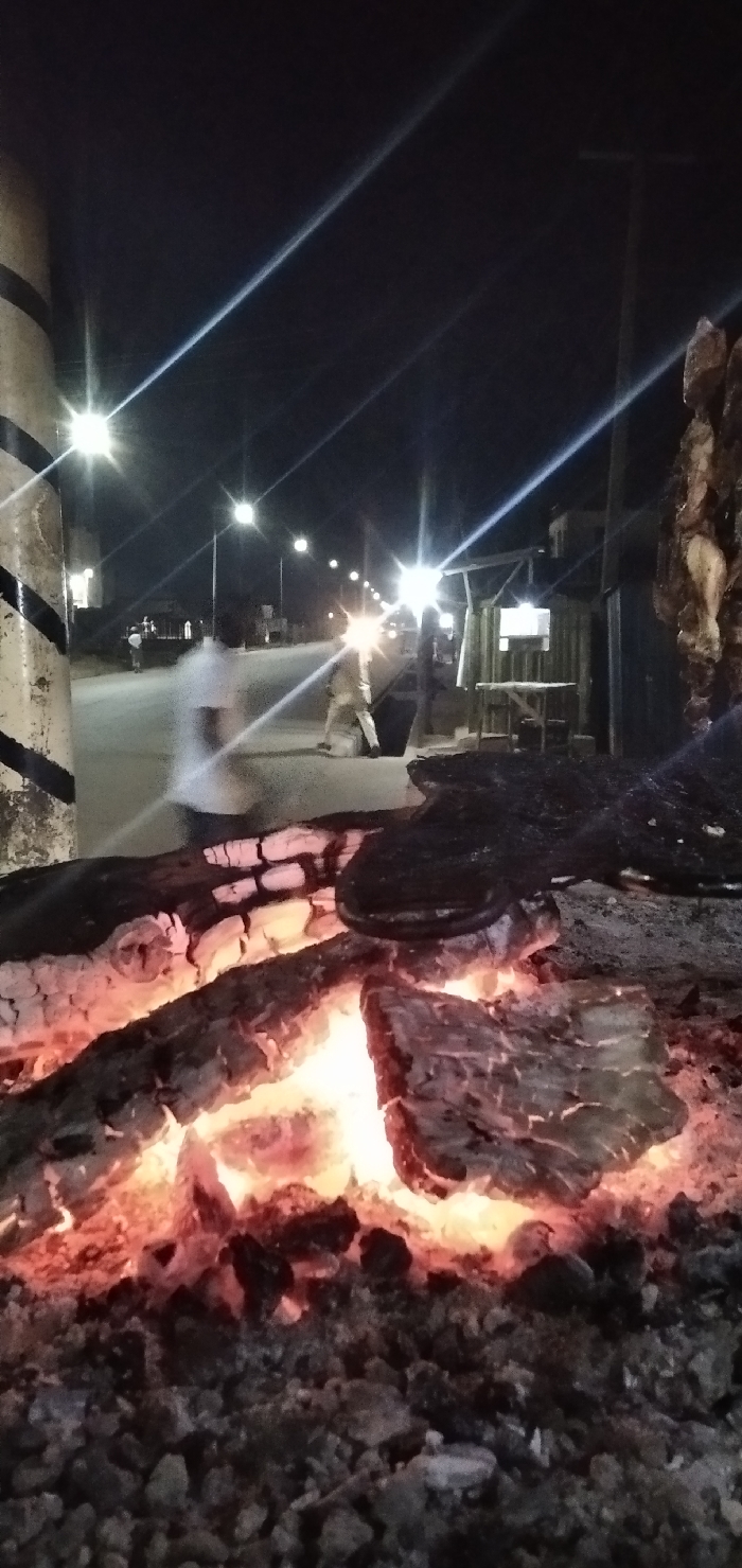 The image captures a nighttime scene in Unguwar Gabas, Nigeria. In the immediate foreground, a ground-level fire pit contains glowing red-orange embers interspersed with dark, charred wood and ash. A dark, flat cooking surface or grill is positioned directly above a section of the embers. To the far right, several pieces of what appear to be skewered meat are suspended vertically. The midground features a dark, paved road. Two human figures, blurred due to motion, are visible on the road; one figure in light clothing moves from left to right, while another figure, also in light attire, stands or walks further down the road, partially obscured by a bright light flare. On the far left, a light-colored pole with two black diagonal stripes is visible. The background shows a series of activated streetlights illuminating the road, creating distinct starburst flares. To the right of the road, a small, light-colored roadside stall or kiosk is visible, with a table and chairs placed near it. The sky is dark, indicating a nocturnal setting.
