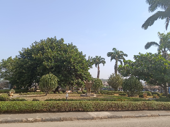 The image depicts a landscaped park area under a clear blue sky, indicative of daylight conditions. In the immediate foreground, a weathered asphalt road with a concrete curb runs horizontally. Behind the curb, a neatly trimmed green hedge forms a border. The midground features a diverse array of vegetation, including a prominent large, dense-canopied tree with dark green leaves on the left, and several tall palm trees scattered towards the right and background. A unique, vertically branched succulent-like plant is visible in the center-left. A bronze-colored statue stands on a stone pedestal in the center of the park, depicting two figures: a larger figure with arms uplifted or outstretched, and a smaller figure positioned beside it. Other decorative elements include golden-colored urns or planters and a white signpost. The ground cover consists of a mix of green grass and drier, brownish patches. In the background, beyond a dark metal fence, some distant structures or a cityscape are partially visible. No individuals are present, and no overt actions or interactions are depicted. This scene is identified as a public park area in Abuja, Nigeria, specifically near the Abuja City Gate, where such monuments and landscaping are common features.