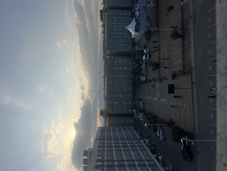This image depicts an outdoor scene in Ongata Rongai ward, Kenya, during late afternoon or early evening, characterized by the sun low on the western horizon, partly obscured by clouds, casting a soft, warm light. The sky is partly cloudy with a pale blue hue above, transitioning to warmer tones near the horizon. Distant mountains and a communication tower are visible against the skyline. The scene is dominated by multiple multi-story residential or dormitory-style buildings. On the left, a tall grey building with a stone-like facade and numerous rectangular windows extends vertically, with cars parked beneath its overhang. In the mid-ground, two additional multi-story buildings are visible: one with a brown/beige facade and another with a green facade, both featuring numerous rectangular windows. The ground level is a large, paved parking lot marked with yellow lines and numbered parking spaces (e.g., "600s," "700s"). Numerous vehicles, including sedans, SUVs, and vans of various colors (white, black, silver, dark tones), are parked in designated spaces. Several solar-powered streetlights are strategically placed throughout the parking area. Small trees and shrubs are planted along the edges and within the lot. People are actively present in various areas. In the central parking lot, approximately ten individuals are visible. Some are standing, observing, or walking. A group of individuals appears to be gathered around a basketball hoop structure (rim and backboard visible, no net). Two individuals are distinctly positioned near this hoop. On the far right, an elevated platform features a large white tent with a pointed roof. Underneath and around this tent, a significant gathering of people is occurring, with individuals seated at tables and others standing. People are also seen standing or walking near the grey building on the left.