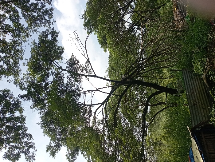 The image depicts an overgrown outdoor area within the city of Meycauayan, Philippines. The scene is dominated by a large, leafy tree centered in the frame, featuring a dark trunk and numerous branches covered in dense green foliage. Several branches, particularly on the right, appear to be partially denuded or bare. Additional trees with full green canopies are visible in the background and along the upper edges of the image. The sky, visible through the tree cover, is light blue with scattered white clouds. The ground is thickly covered with various green undergrowth, weeds, and smaller plants. In the lower-left foreground, a corrugated metal sheet is partially visible, positioned near a dark, indistinct structure partially covered by a blue tarpaulin. In the lower-right, a pile of dark, amorphous refuse is present amidst the vegetation. No individuals, actions, or specific interactions are observed in the image.