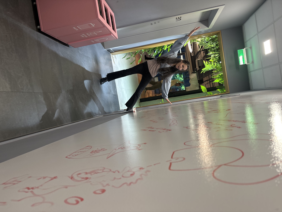 An indoor scene in Busmantsi, Bulgaria, depicts a well-lit modern hallway or corridor. A young adult female, with long dark hair, wears a light blue long-sleeved top, black flared trousers, and black boots. She is positioned playfully, balancing on her right foot while her left leg is extended horizontally, with the sole of her left foot resting against a tall, white wall that dominates the right side of the frame. Her arms are also extended horizontally for balance, and she is smiling towards the camera. The white wall is extensively covered with red marker drawings, doodles, and text, suggesting it is a collaborative writing surface. To the left, a grey wall features an elevator door marked "en" and a set of three interconnected pink recycling bins on wheels, labeled "WASTE," "PLASTIC," and "PAPER" with corresponding icons. The floor is covered with large, dark grey tiles. Overhead, a suspended ceiling contains square recessed light fixtures and a green-lit emergency exit sign. In the background, through an open doorway, an area characterized by abundant green foliage (ferns and other plants) is visible, with exposed dark ceiling infrastructure and a circular light fixture. A second individual, a male in a light-colored shirt, is partially visible standing within this green-themed area, looking towards the main subject or the camera. Shadows from the primary subject are cast onto the tiled floor.