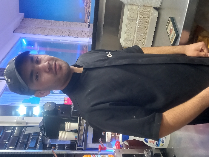A man with dark hair and a cap poses indoors, his body angled towards the right. He wears a black shirt with white lettering. Behind him is a beverage machine and condiment bottles on a stainless steel surface. A wall with a blue and white design is visible. To the right, there are takeout containers and a cell phone on a stainless steel surface.