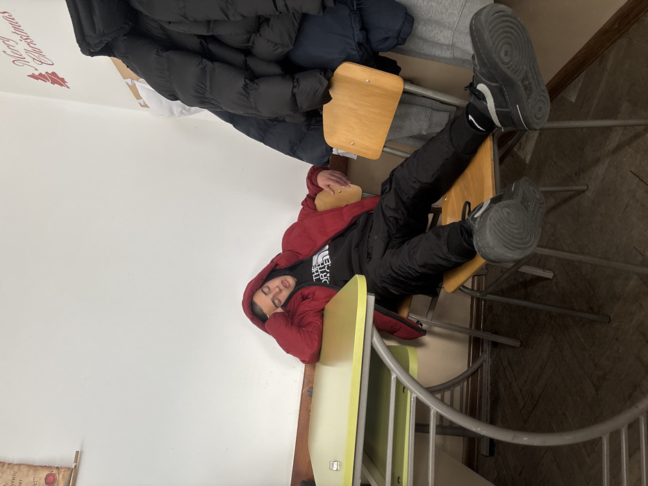 An indoor scene in what appears to be a classroom or common room in Zlatograd, Bulgaria, depicts a young male individual asleep