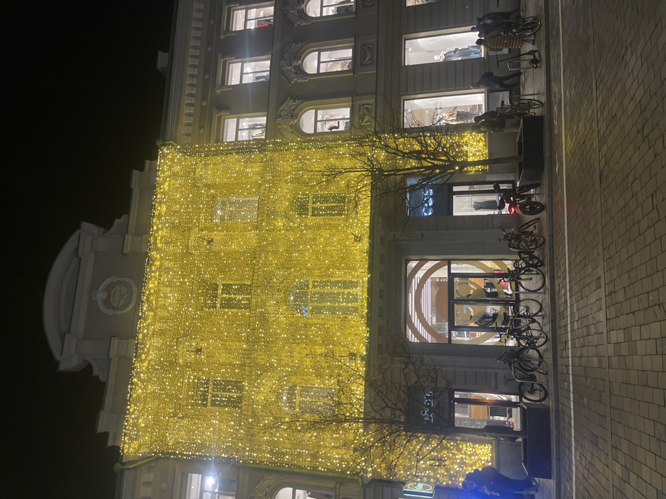 A tall building at night, partially covered in numerous small, bright yellow lights. A section of the building to the right is not covered, revealing lit windows and a large glass entrance. Bicycles are parked in front. Bare trees obscure some of the building. The building is ornate with detailed architectural features. A portion of the building on the left has a rounded, decorative element. The street is paved.
