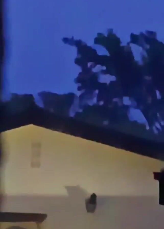 partially obscured view of the side of a building at night. The building has a light-colored exterior with a dark roofline. There are some shadows and an air conditioner unit on the wall. A dark, leafy tree in the foreground partially blocks the view of the building. Inside the building, seen through a window, people are sitting at tables and appear to be eating.