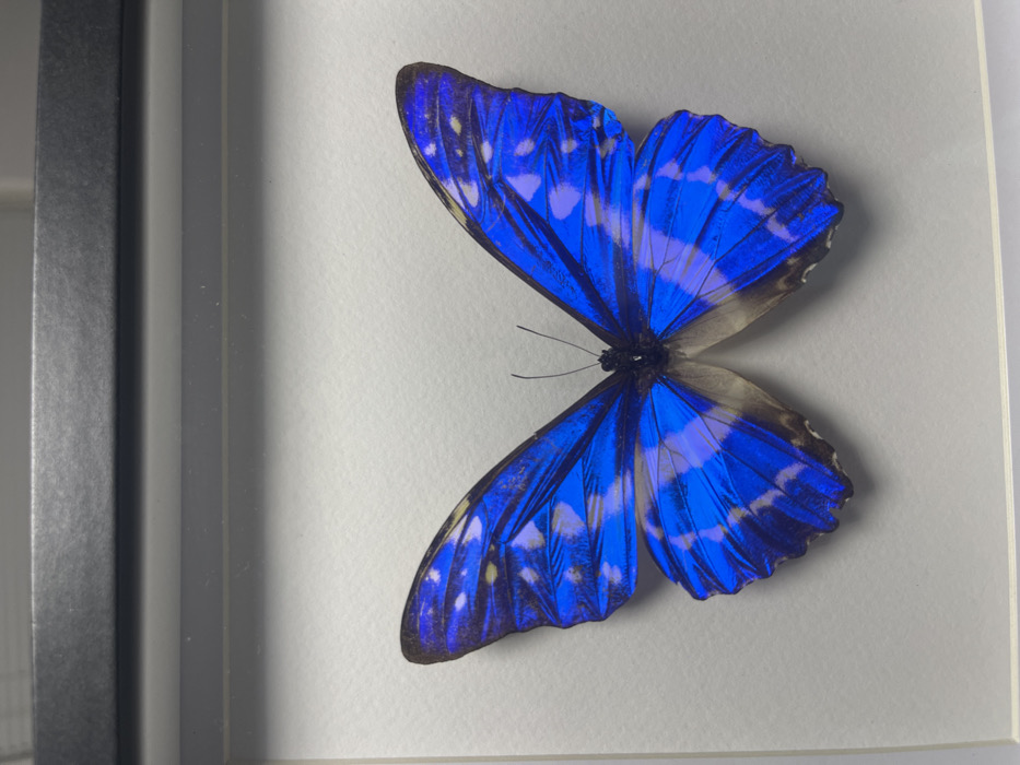 - "The image displays a single, preserved Morpho butterfly mounted within a rectangular shadow box frame" by FM-4unv33, licensed under CC BY 4.0