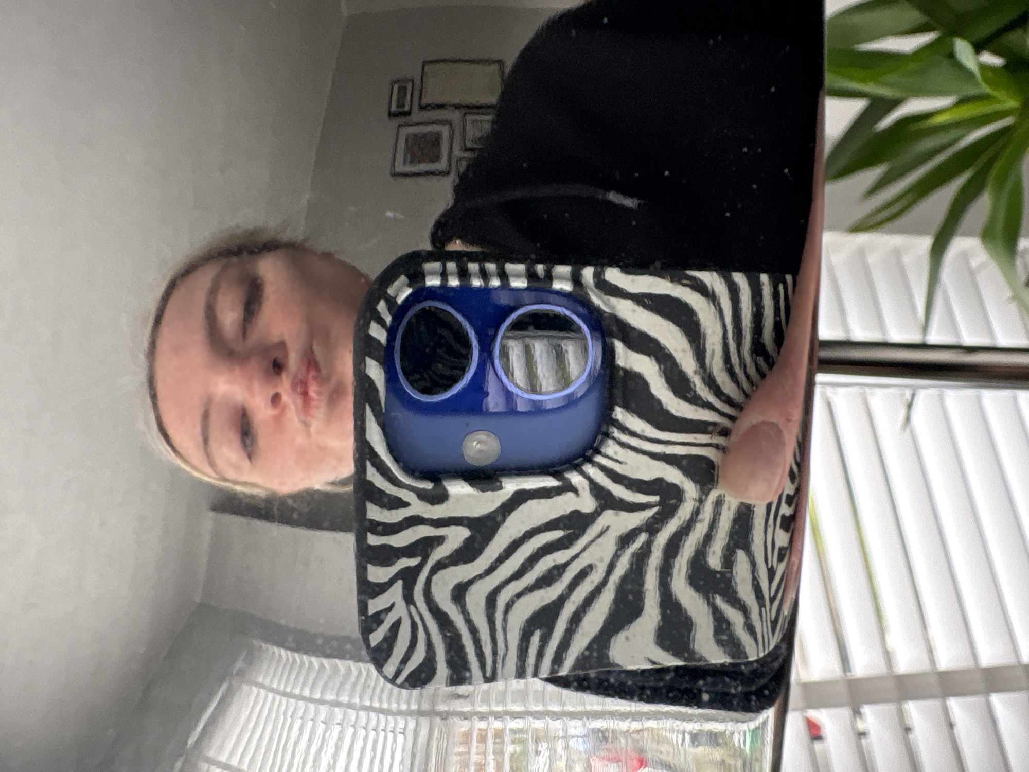 The image displays a mirror selfie captured by a blonde-haired female in a domestic residence in Manchester, United Kingdom. The female's partially visible face, positioned in the upper frame, exhibits puckered lips. She holds a blue smartphone, encased in a black and white zebra-print cover, with her right hand; a portion of her thumb is visible on the case's lower edge. The phone's rear camera lenses and flash unit are discernible through the case. The reflected background environment includes a window fitted with white horizontal blinds on the left, a light-colored wall displaying multiple framed pictures of various sizes on the right, and a green houseplant situated in the lower right corner. A plain, light-colored ceiling is visible in the upper reflected area.