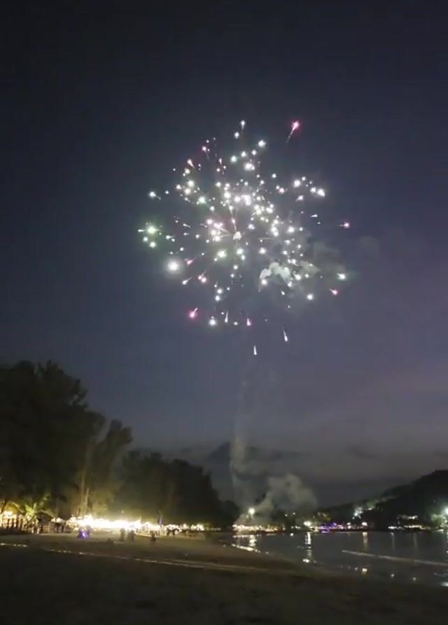 The video depicts a nighttime scene at a beach, with fireworks lighting up the sky