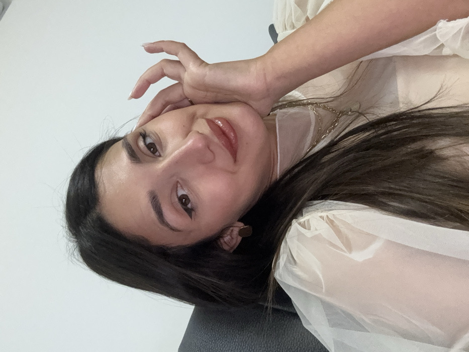The image displays a single female subject positioned indoors. She has long, dark brown hair and a fair complexion. Her right hand is raised, fingers gently curved, resting against the right side of her face and jawline. She looks directly forward with a slight smile. The subject wears a sheer, light-colored blouse with puffed sleeves, a layered gold-toned necklace, and a small, flat, dark-colored earring in her visible left ear. A dark chair back is visible behind her left shoulder. The background is a plain, light-colored wall. No discernible environmental features within the image indicate a specific geographical location in the city of Budva, Montenegro.