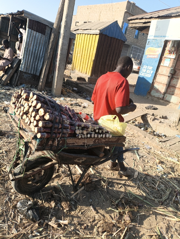 A man in a red shirt stands behind a wheelbarrow piled high with sugarcane. The cart is parked on a dirt street littered with debris. Nearby are makeshift corrugated metal structures and small, brightly colored wooden buildings. A sign advertising custard is visible in the background, along with parts of other buildings and parked cars. The scene depicts a casual street vending setup in what appears to be a less affluent area.