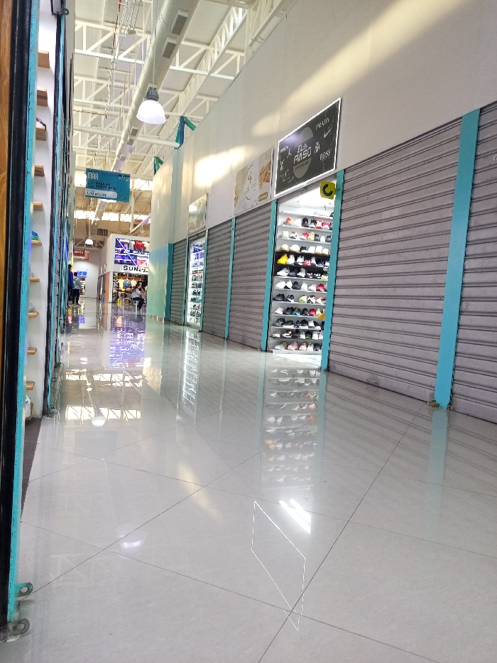 The image displays an interior view of a commercial corridor, located in the city of Unknown, Unknown. The perspective is low, looking down a brightly illuminated hall with a highly reflective, polished light-colored tiled floor that mirrors the overhead structures and shop lighting. The ceiling features an exposed white metal truss framework with multiple hanging dome-shaped pendant light fixtures. On the left, an open shop entrance with multi-tiered shelving is partially visible, followed by several open shops further down the corridor. A blue banner sign hangs overhead, partially reading "MAR BASA DO GUAYAQUIL" and "1 LT". Multiple indistinct individuals are visible in the distance on the left, with one person seated inside a shop. The right side of the corridor presents a series of storefronts. Most are secured by closed grey metal roll-down shutters, accented by light blue vertical wall sections. One shop on the right is partially open, showcasing numerous athletic shoes displayed on clear, vertically stacked shelves within a brightly lit interior. Above this opening, a black sign lists brand names including "PRADA," "NIKE," "BOSS," "JORDAN," and "ADIDAS," prominently featuring "EL PASO." Another partially open shop further down the right also displays illuminated merchandise. A rectangular patch of intense light, consistent with sunlight, illuminates the upper right wall.