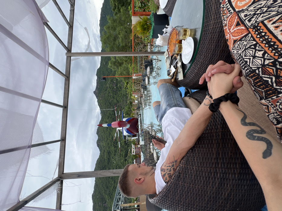 The image captures an outdoor, elevated cafe or restaurant setting in Nha Trang, Vietnam, specifically within the Hòn Rơm Tourist Area. An overcast sky looms above lush, green, vegetation-covered mountains that form the backdrop. In the foreground, a male subject reclines in a dark brown woven armchair, facing right. He wears a white t-shirt and light blue denim shorts, with a short haircut and faded sides. Tattoos are visible on his right bicep (leopard print/abstract) and left wrist (circular symbol). He holds a black smartphone in both hands, directing his gaze downward at the device. His right hand is clasped by the left hand of a second, partially visible subject in the immediate foreground. This second subject wears patterned clothing (orange, black, and white geometric designs) and has a black scrunchie on their wrist and a prominent black snake tattoo on their left forearm. A round, dark brown woven table separates the subjects. Upon it rests two clear glasses containing an amber liquid, a white teapot, a small white ceramic plate with a napkin, a small wicker basket holding orange items (possibly snacks), a white tissue dispenser, a black wallet, and other small personal effects. Beyond the subjects, a light blue paved or tiled patio extends, furnished with numerous ornate metal chairs and tables. A prominent feature in the mid-ground is the static display tail section of a helicopter, identified as a Mil Mi-8 series, painted red, white, and blue. The patio area is adorned with potted green plants and is bordered by an ornate orange and black metal railing. An overhead canopy, constructed from a wooden and metal framework supporting worn white mesh fabric, covers the seating area.