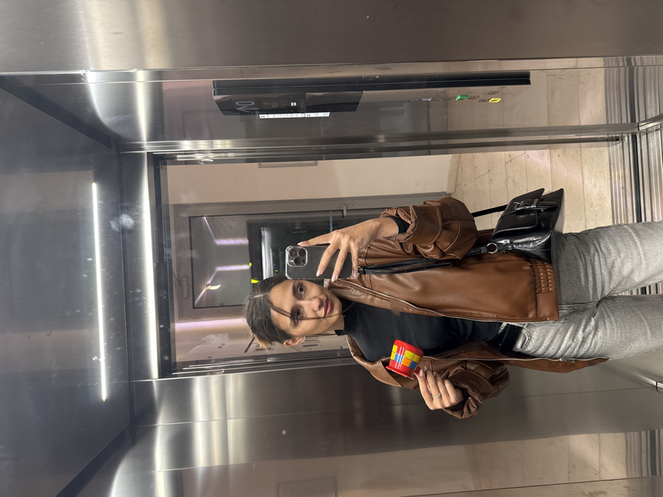 The image depicts a female subject in a modern elevator within a building in Budva, Montenegro. The woman, with dark hair pulled back and light makeup, is positioned facing a reflective surface, presumably a mirror or highly polished metal wall, capturing a selfie with her right hand holding a dark-colored smartphone equipped with at least three camera lenses. She wears a black turtleneck shirt, an open brown leather bomber jacket, and light grey denim jeans. A black shoulder bag with a silver-toned buckle is slung over her left shoulder. In her left hand, she holds a small, rectangular object, approximately 5 cm in length, displaying distinct red, yellow, green, and blue colored panels, consistent with a miniature puzzle or toy, from which a white stick-like element extends downwards. A silver-colored ring is visible on her left ring finger. The elevator interior walls are constructed of polished stainless steel, and a horizontal fluorescent light fixture is visible on the ceiling. Reflected on the right side of the image is an elevator control panel featuring illuminated green, yellow, and red buttons, and a digital display showing "M" and "0" or "O". Through the elevator's reflective door, a portion of a hallway with light-colored walls and a closed door is discernible in the background. No specific landmarks or unique architectural features within Budva are present in the image to determine the precise building location.