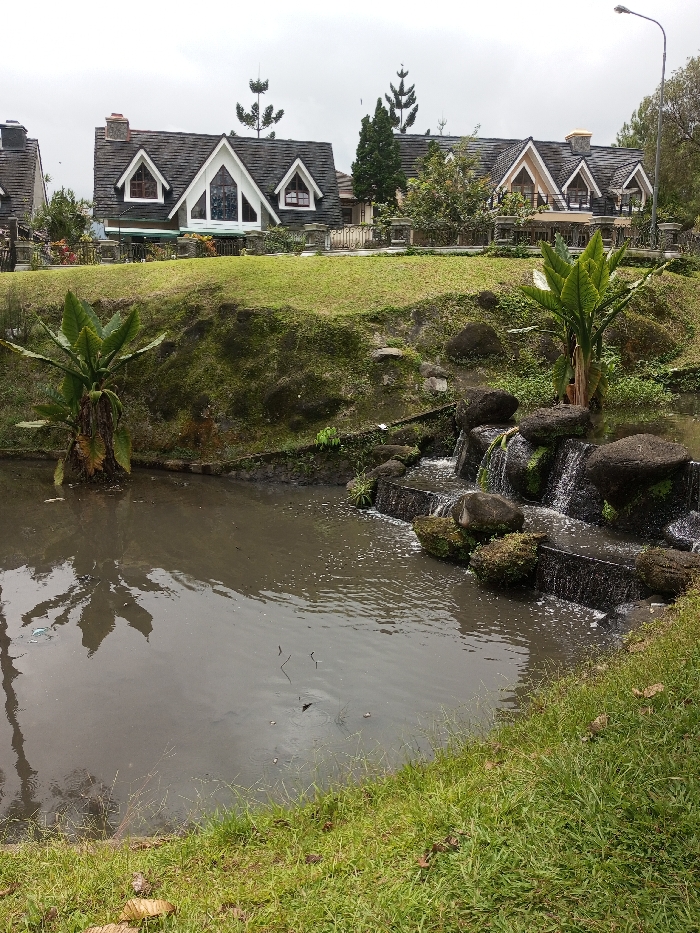 A tranquil scene presents a pond with murky water, reflecting a tall, slender plant. A small, tiered waterfall flows into the pond, adorned with mossy rocks. Above the pond, a well-manicured lawn stretches to a row of charming houses with steeply pitched roofs. Overcast sky completes the serene, almost fairytale-like setting.