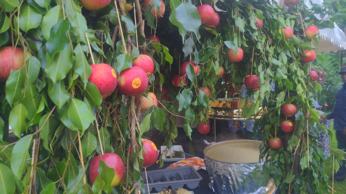 This image depicts an outdoor event or gathering in Kondeni, Tanzania, characterized by a prominent decorative structure featuring numerous artificial red apples interspersed with dense green foliage. Approximately 30-40 red apples, each bearing a circular yellow sticker, are individually suspended by thin wires or strings from leafy branches, forming an overhead canopy or archway. Below this apple-and-leaf arrangement, a serving area is visible. A large, round metallic container, partially wrapped in aluminum foil, stands on a surface to the right, containing a pale liquid or food item and a wooden stirring implement. Adjacent to it, a gray plastic tray, a small white dish with green herbs, and various food items, including what appear to be sliced orange vegetables, are arranged on a surface. In the background, blurred figures of individuals are present, with one person on the far right wearing a dark hat and shirt. A white tent or canopy structure is partially visible in the upper right. The ground is covered with green grass, indicating an outdoor setting.