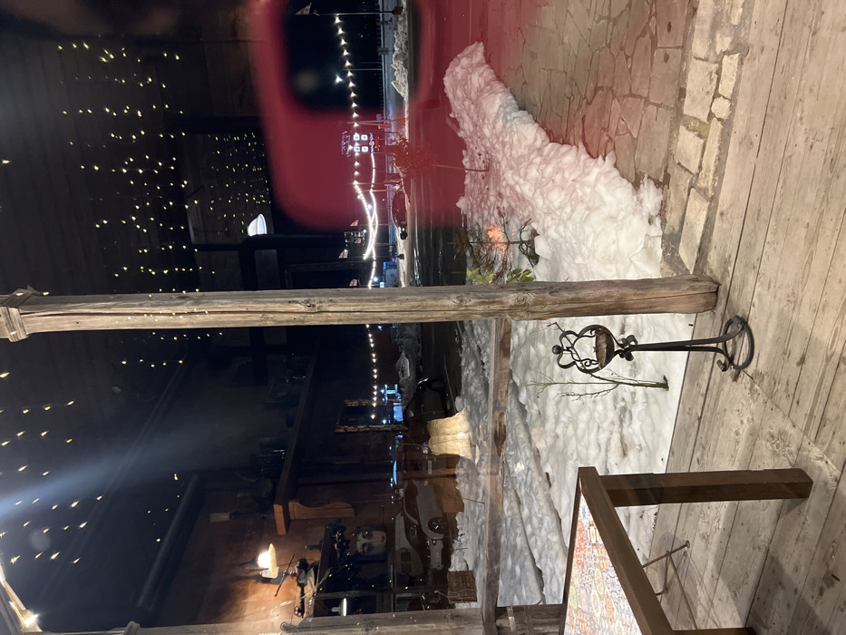 The image depicts a nighttime outdoor scene, likely a covered patio or veranda, looking out onto a snow-covered street or parking lot in the city of Argveta, Georgia. In the foreground, a wooden floor or deck is visible, with a square wooden table featuring a multi-colored patterned top on the left. To the right, a black wrought-iron decorative stand, approximately 0.7 meters tall, is positioned near a substantial, light-colored wooden pillar that extends vertically through the frame. Beyond a low wooden railing, the ground is covered in undisturbed white snow. Several small, bare trees or shrubs are visible emerging from the snow. A large, uneven pile of snow, approximately 0.5 meters high, runs parallel to the wooden structure on the right, separating the snow-covered ground from a paved area of irregular stone or concrete pavers. In the middle ground, through the snow and across what appears to be a parking area or road, several parked vehicles are discernible, some partially covered in snow. A series of white string lights with individual bulbs stretches horizontally across the scene in the distance, illuminating the area. Additional string lights are visible hanging from the dark overhead structure of the immediate foreground. Georgian flags are faintly visible on poles in the background. The interior space from which the image is taken features a dark ceiling adorned with numerous small, warm-toned string lights. Through the glass, the reflection of an interior wall with shelves holding various objects, including bottles and a decorative bust, is apparent. A prominent red, rectangular reflection, consistent with a smartphone casing, is visible in the middle-right portion of the image, partially obscuring the background. No individuals are visible in the scene.