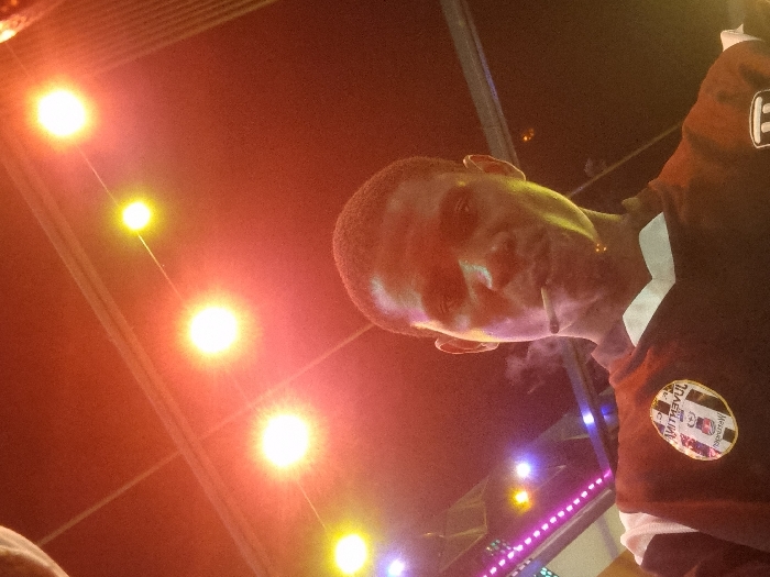 A male subject, appearing to be of African descent with short dark hair, is depicted in a close-up, upward-angled shot. He is positioned centrally, looking directly into the camera. A cigarette or similar rolled item is held between his lips, with a plume of smoke visible emanating from it on the left side of his face. He is wearing a dark-colored shirt with a white V-neck collar and white shoulder accents. A circular, monochrome Juventus football club logo is affixed to the left side of his chest. The background is dimly lit with multiple artificial light sources. Overhead, four distinct, bright, warm-toned (yellow/orange) circular lights are visible, arranged in a line, casting a reddish hue across the upper frame. To the left of the subject, a vertical array of purple and blue decorative lights is visible on an unseen structure. The setting appears to be an indoor or covered nighttime environment. The scene is located in Obosi, Nigeria.