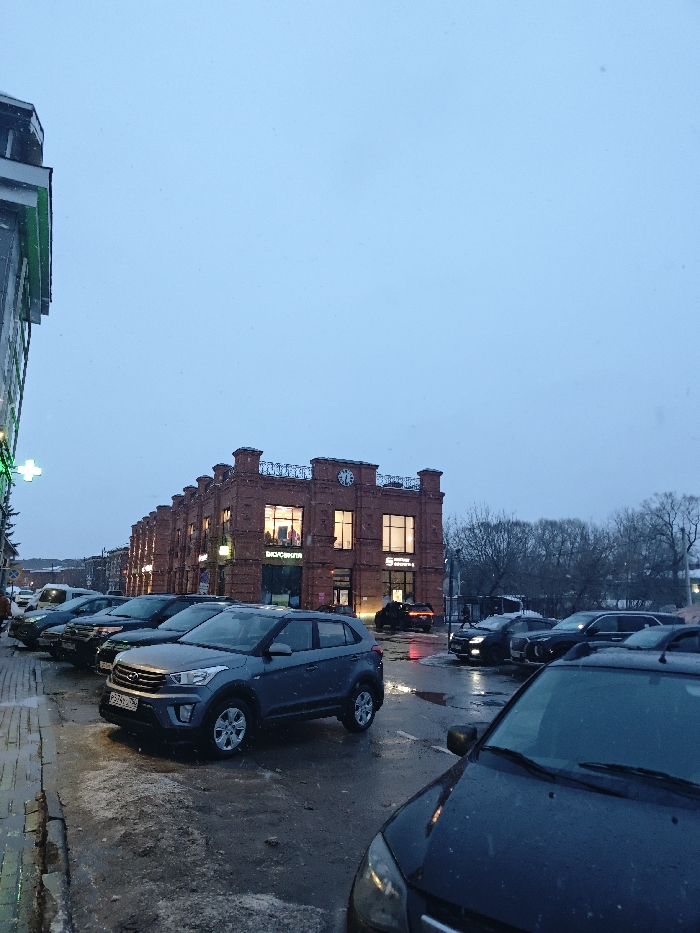 The image depicts a street scene in Yakhroma, Russia, under an overcast, light blue sky, with visible light snowfall. The ground consists of asphalt road and a sidewalk, marked by patches of melting snow, slush, and puddles reflecting ambient light. In the mid-ground, a long, two-story red-brick commercial building is prominent, featuring repeating decorative architectural elements, large illuminated ground-floor windows, and a clock face on its facade. Storefront signs are visible, including "ВКУСВИЛЛ" (VkusVill) and a partially visible "DNS". To the left, a multi-story building is partially visible, displaying an illuminated green cross sign. A street light pole and a pedestrian crossing sign are also visible on the left. Multiple passenger vehicles are parked along the street. In the left mid-ground, a row of dark-colored vehicles is parked along the sidewalk, including a dark grey Hyundai Creta SUV with Russian license plate P836TT 799. Further to the right, on the opposite side of the street, more dark-colored vehicles are parked, some with headlights on. The front section of another dark vehicle is in the immediate foreground, partially obstructing the view. Bare trees are visible in the background, beyond the red-brick building, against the grey sky. No individuals are discernible in the scene.