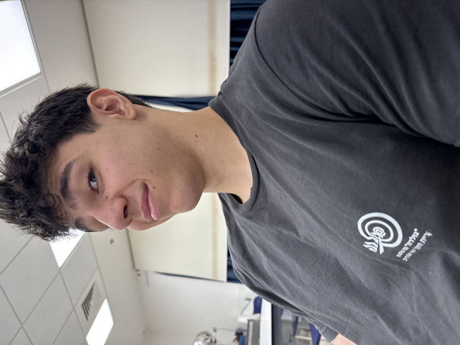 A young man with dark, curly hair and olive skin wears a gray t-shirt with a circular emblem on the upper right. He looks at the camera with a slight smile. The background features a brightly lit room with white walls and ceiling panels. A window with blinds is visible in the distance. The image is rotated slightly, causing a tilted perspective.