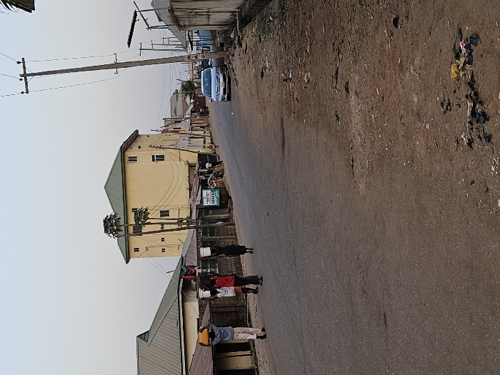 A narrow street scene is shown with power lines overhead. Buildings line the left side, varying in height and color, including a yellow structure with a green roof. Several people walk along the street, holding what appear to be buckets. A blue car is visible further up the road. The street itself is mostly bare, with some debris and dirt on the right edge. The sky is a muted color, suggesting either dawn or dusk.